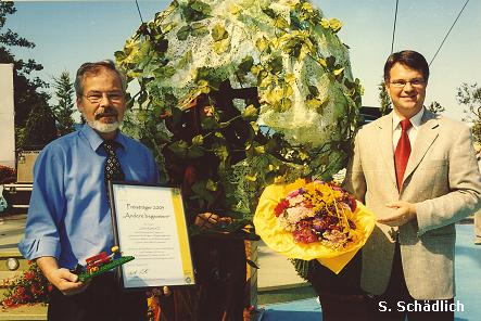 Mit einer Goldmedaille hat Gera im bundesweiten Stadtverschönerungswettbewerb „Entente florale" für Aufsehen gesorgt. Bundeslandwirtschaftsministerin Renate Kühnast (Bündnis 90/Grüne) überreichte die Ehrung gestern vor 1500 begeisterten Zuschauern auf dem Gelände des ZDF-Fernsehgartens in Mainz.