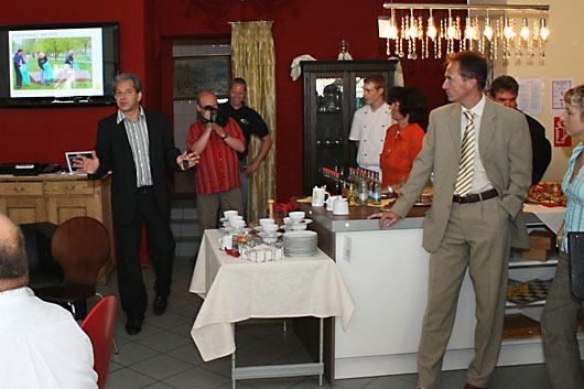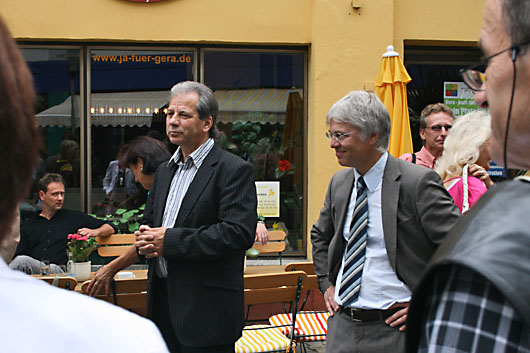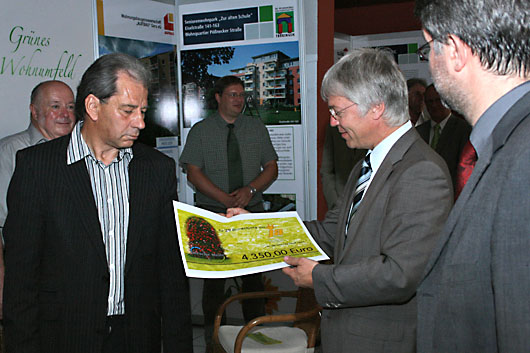 Im Anschluss an die Projektvorstellung konnte Volker Tauchert im Rahmen der Eröffnung der Ausstellung „Grünes Wohnumfeld” einen symbolischen Scheck in Höhe von 4.350,00 € für die Aufstellung und Bepflanzung der Blumensäulen an den Oberbürgermeister der Stadt, Dr. Norbert Vornehm übergeben.