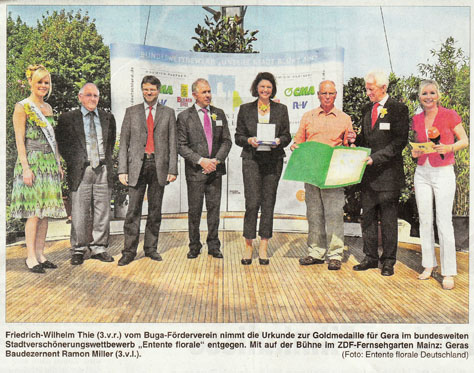 "Das ist eine Überraschung" freute sich Hr. Miller (Baudezernent Stadt Gera) am vergangenen Dienstag, nach dem er gemeinsam mit Hr. Thie (Buga Förderverein) im ZDF Fernsehgarten in Mainz vor 1000 Zuschauern die Goldmedaille für den bundesweiten Stadtverschönerungswettbewerb "Entente Florale" entgegennehmen durfte. Mit der Goldmedaille wird die Bundesgartenschau 2007 veredelt.