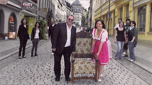Für den Lust-Genuss am Samstag auf der Gerschen Meile stellen Händler Andreas Lobert und Verkäuferin Jacqueline Bätzold für Besucher den Stuhl schon einmal probehalber in der Großen Kirchstraße in Geras Innenstadt bereit. Zum Verweilen wird eingeladen.