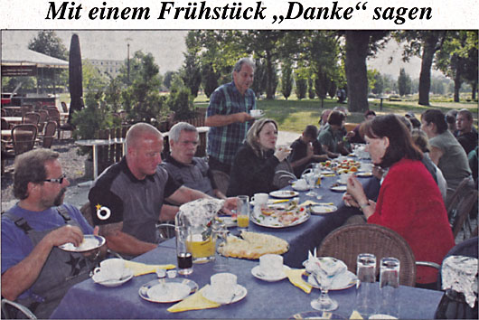 Es war die Idee von Volker Tauchert (stehend) und dem „Ja - für Gera” e.V.: ein gemeinsames Frühstück für die Fluthelfer, die im Hofwiesenpark zur Schaufel griffen. Gleichzeitig wurden vom Verein zwei Spenden von 500 und 100 Euro an die Geraer Kultur GmbH überreicht.