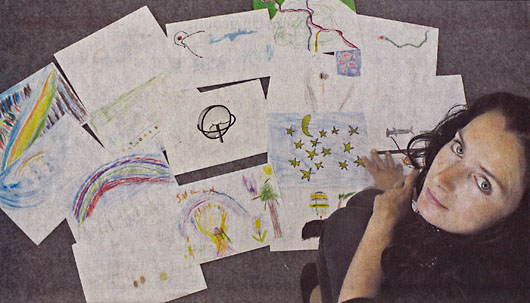 Birgit Kremer-Masuhr zeigt die Vorschläge der Erstklässler, die diese für die Spielkugel auf dem Zschochernplatz gezeichnet haben.