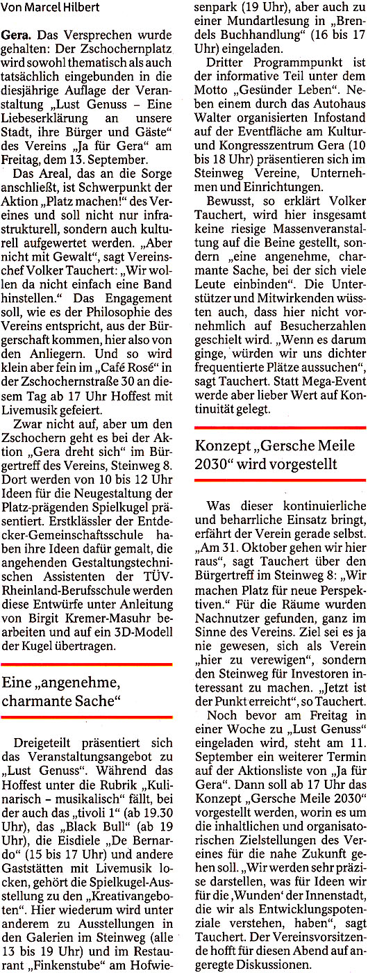 „Eine Liebeserklärung an unsere Stadt, ihre Bürger und Gäste” nennt der Verein „Ja für Gera” seine kostenlose Veranstaltung „Lust Genuss” am 13. September. Dabei geht es nicht um ein Mega-Event, sondern um Kontinuität.