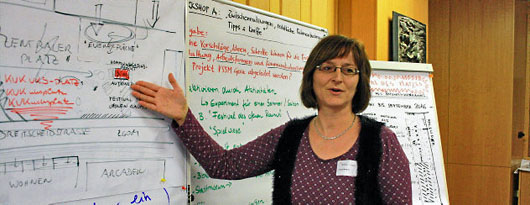 Mit Beispielen aus Madrid, Hamburg und Leipzig, die zeigten, wie eine Idee zünden, viele anstecken und dann Wirklichkeit werden kann, waren die Teilnehmer eingestimmt worden. In drei Gruppen trugen sie Vorschläge zur Zwischennutzung der Fläche, zu Betreibermodellen und Verantwortlichkeiten zusammen. Unternehmerin Petra Wagnerhatte sich mit ihrer Gruppe Gedanken zur Zwischennutzung gemacht. Eine Box als fester Anlaufpunkt stellt man sich vor und von Mai bis September 2016 ein „Festival des Platzes“. Regelmäßige Angebote würden so die Fläche beleben. Sogar ein Plakat „Betreten erwünscht!“ wollen sich die Teilnehmer vorstellen. „Ich habe überhaupt nicht verstanden, warum sich im Sommer keiner in die Wiese gesetzt hat“, meinte Baudezernentin Claudia Baumgartner (parteilos), die zu dieser Arbeitsgruppe gehörte und einen Bouleplatz vorschlug.