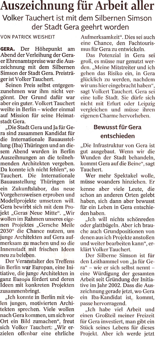 Volker Tauchert sieht den Silbernen Simson als Würdigung aller, die bei „Ja für Gera” mitwirken.