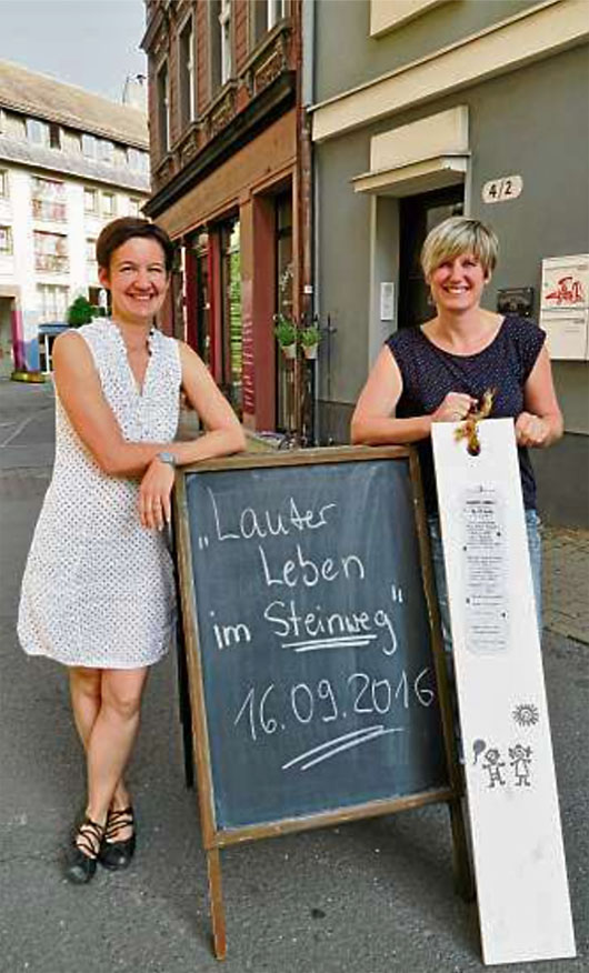 Jana Huster (l.) öffnet ihren „Steinwegerich“ länger und Christiane Staudte heißt Neugierige in ihrer „Gestalterei“ willkommen. Mit einem von ihr gestalteten Info-Brett machen alle teilnehmenden Geschäfte auf sich aufmerksam.