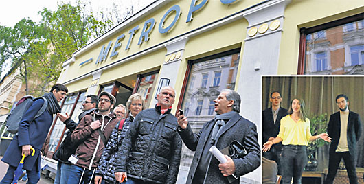 Volker Tauchert (rechts) vom Verein „Ja-für Gera“, Gastgeber der Frühjahrstagung des City-Management-Verbandes Ost, führte den Stadtrundgang für interessierte Tagungsteilnehmer an. Eines ihrer Ziele war das Programm-Kino „Metropol“, das sich durch Bürgerengagement entwickelt hat. Bild rechts: Bei der Frühjahrstagung schilderten junge Geraer, warum sie sich für ihre Stadt einsetzen. Von links: Martin Greipel, Alexandra Klinke und Valentin Kirchner.