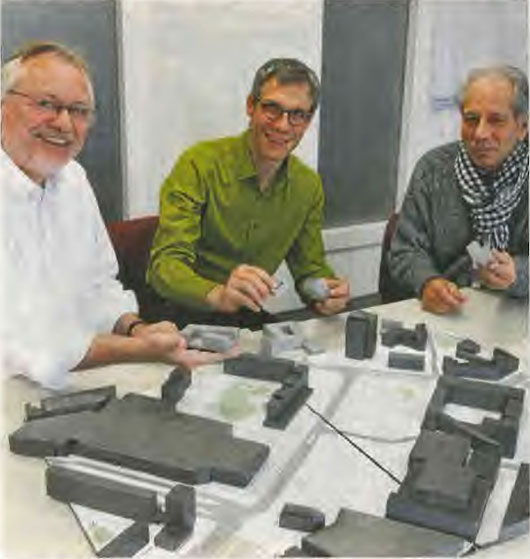 Vertreter der drei Projektpartner von Geras Neuer Mitte an einem Modell des Platzes an der Breitscheidstraße: Thomas Leidet von der Geraer Stadtverwaltung, Bertram Schiffers von der Internationalen Bauausstellung Thüringen und Volker Tauchert vom Verein Ja für Gera (von links).