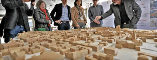 Der Fachgebietsleiter für Bauplanung, Konrad Steinbrecht (rechts), führte gestern die Fraktionsvorsitzende von Bündnis 90/Die Grünen im Bundestag Katrin Göring-Eckardt(3.von rechts) durch die Ausstellung „KuK an 2!“ zum Rahmenplan „plus“ für Geras Neue Mitte. Bis 21. Februar sind Varianten und Pläne des Iba-Kandidaten-Projektes im Foyer des Kongresszentrums zu sehen. Am Vormittag hatte sich die Abgeordnete bereits beim Verein Astronomisches Zentrum Gera über das Projekt einer Sternwarte in Liebschwitz informiert.